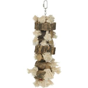 Een houten speeltouw voor agapornide en andere parkietachtige vogelsoorten. Naturel touw met houten blokken, voor urenlang speelplezier. Inclusief ophangketting.