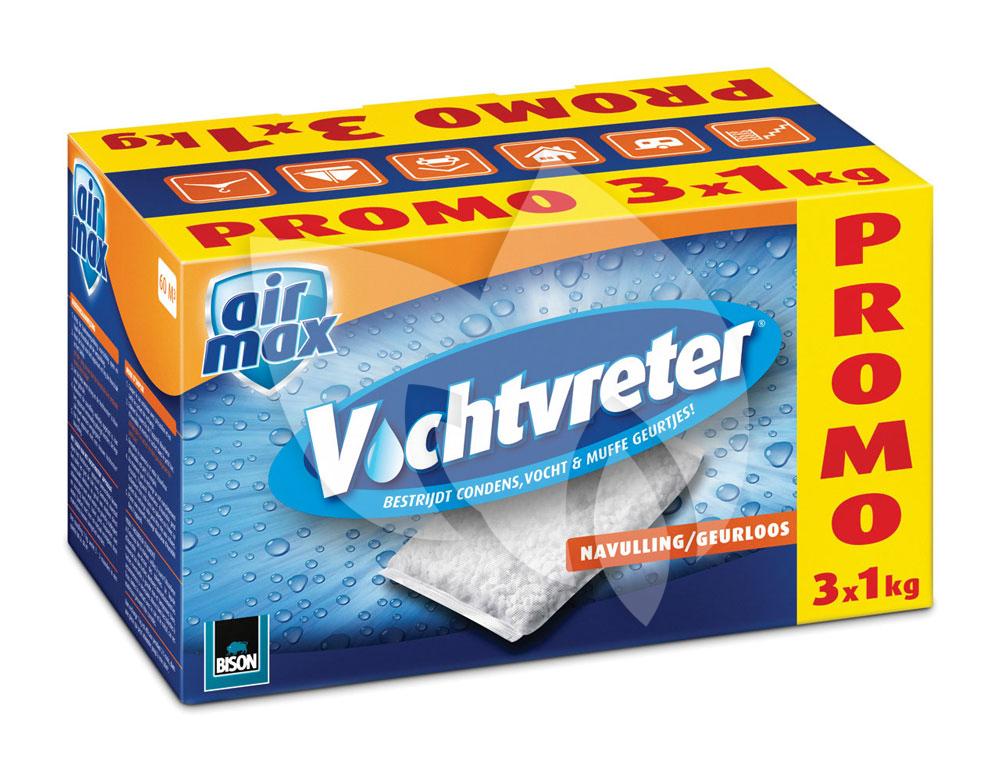De Air Max vochtvreter navulling is een navulling voor de Air Max vochtvreter 1 kg. De verpakking bestaat uit 3 navullingen van ieder 1 kg. Een vochtvreter zorgt ervoor dat overtollig vocht in een ruimte wordt opgenomen en opgevangen. Dit verlaagt de luchtvochtigheid in gesloten ruimtes zonder ventilatie in bijvoorbeeld een caravan, boot, schuur, zolder, meterkast, kelder, kruipruimte, logeerkamer, kledingkast, tuinhuis, keukenkast en dergelijke. De navulling is geurloos maar is ook verkrijgbaar in lavendelgeur.
