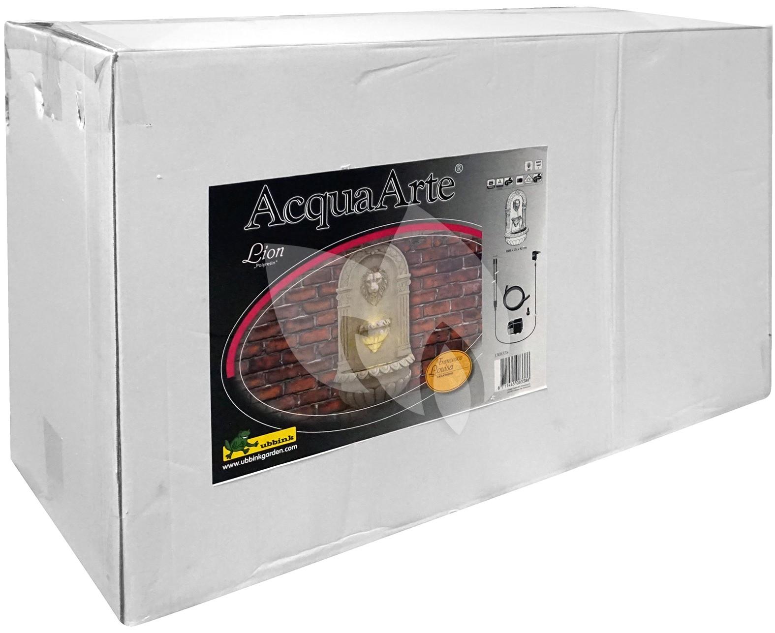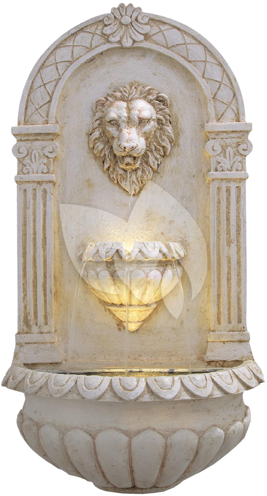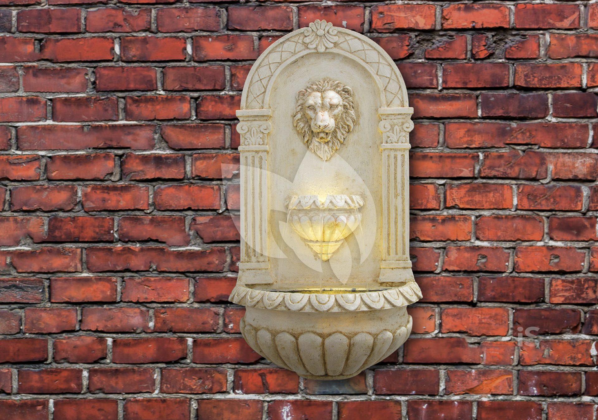 Rustiek waterspel van een waterspuwende leeuwenkop met geïntegreerde LED-verlichting. De leeuwenkop spuwt het water vanuit de bek in het waterreservoir. Kan aan een muur of wand bevestigd worden, voor binnen- of buitengebruik.