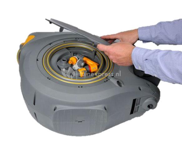Deze haspel is de grootst beschikbare slanghaspel met een automatische oprolfunctie. Heeft u een grote tuin en kost het opbergen van een tuinslang u teveel kracht of moeite, dan kunt u aan deze haspel een goed hulpmiddel hebben. Het oprolmechanisme zorgt ervoor dat u de tuinslang zonder enige moeite en vieze handen weer veilig opbergt in de gesloten slanghaspel. De slanghaspel bevestigt u aan de muur waar hij 180 graden wendbaar is; na gebruik klapt u de haspel in waardoor de ingenomen ruimte beperkt is.