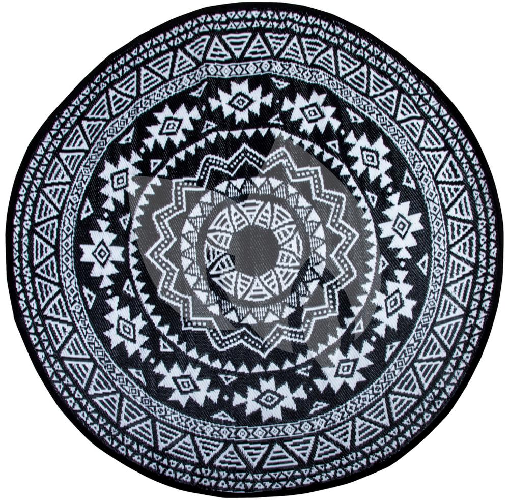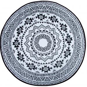 Rond is het nieuwe recht! Waar men voornamelijk geneigd is lijnrechte vormen in de inrichting terug te laten komen, maakt rond nu zijn opmars! Zo ook dit ronde tuintapijt met Azteken print. Het vloerkleed heeft een diameter van 180cm. Dit leuke kleed is uiteraard onder uw tuinset te plaatsen, maar denkt u ook eens aan een gedeelte van uw loungeset; het tuintapijt kan ervoor zorgen dat dat bijzettafeltje met uw favoriete planten nog meer in het oog springt!