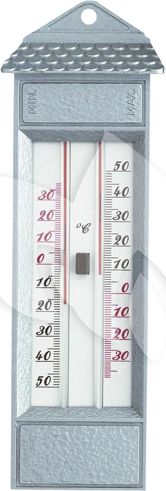 Deze decoratieve thermometer geeft dagelijks de minimale en maximale temperatuur aan. De thermometer is kwikvrij en voorzien van resetknop. De zilverkleurige thermometer is van metaal en is voorzien van een decoratief dakje.