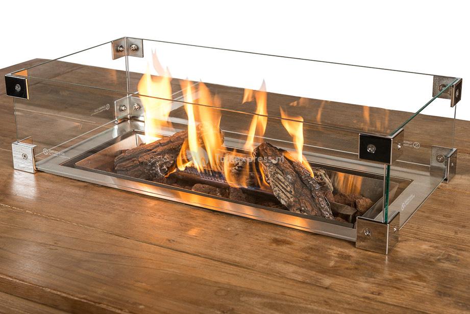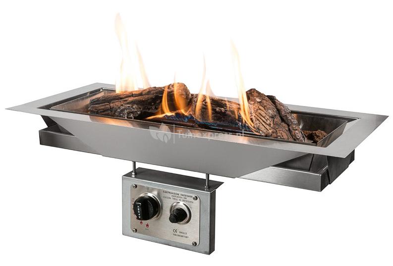 De rechthoekige inbouwbrander werkt op gas en is voorzien van een RVS-brander van 12kW. De brander wordt mooi gecamoufleerd door optische lavastenen en houtblokken. Hierdoor lijkt het vuur op een echt houtgestookt vlammenspel, maar heeft u geen last van rook of rondspringende vonken en dat is wel net zo prettig aan tafel. De haard is zeer gebruiksvriendelijk. Door middel van de elektronische ontsteking steekt u de brander gemakkelijk aan en met de draaiknop kunt u de hoogte van de vlam afstellen.