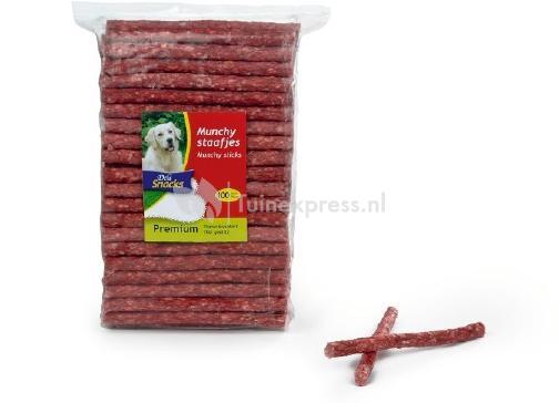 DeliSnacks munchy staafjes rood. 9 tot 10 mm. Verpakt per 100 stuks. Als beloning of gewoon een heerlijk tussendoortje voor uw hond