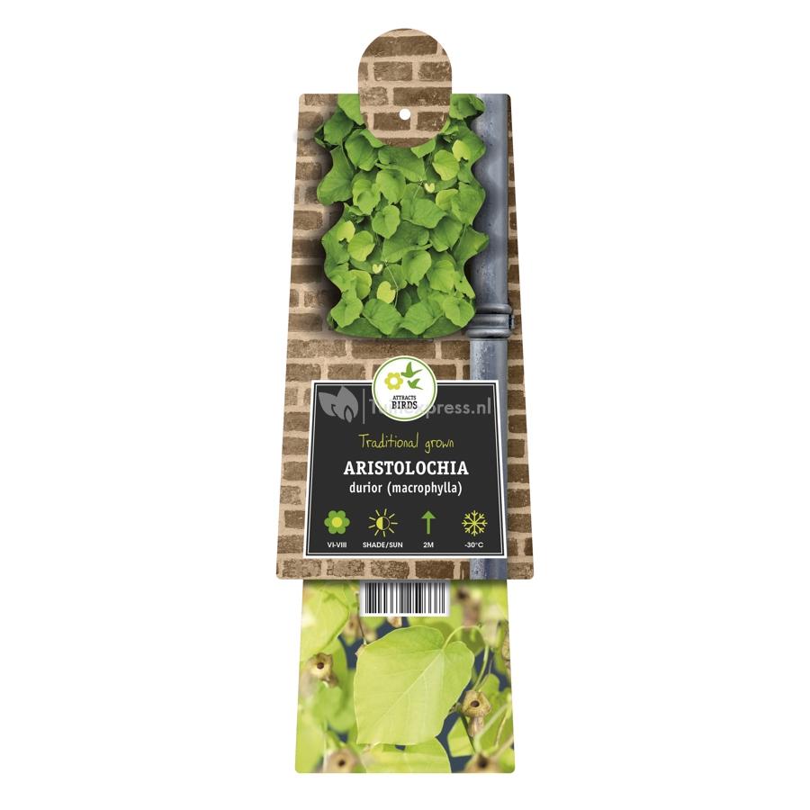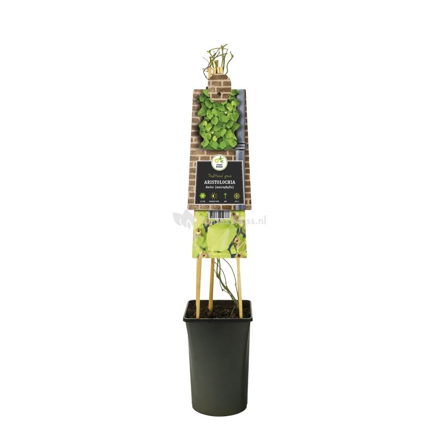 Duitse pijp kenmerkt zich met een groot heldergroen hartvormig blad. Het grote blad kan een doorsnede bereiken van wel 25cm. In een razendsnel tempo kan Duitse pijp dan een groen bladerdek geven. Deze sterke klimmer bloeit in juni en juli met bruingele bloemen die, in verhouding tot het blad, vrij klein zijn. Deze klimplant slingert zich een weg omhoog en kan dan een hoogte van 8m bereiken. Omdat u Duitse pijp op ieder gewenst moment kunt snoeien is de plant zeer geschikt voor bijvoorbeeld een pergola.