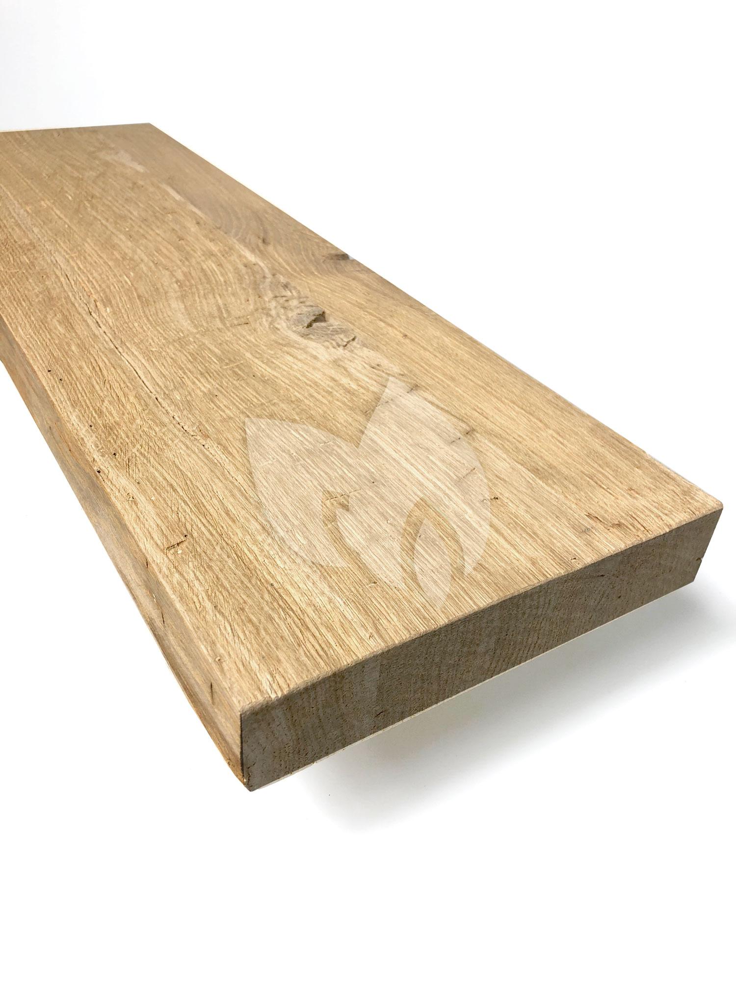 Deze eikenhouten plank van oud hout met recht afgezaagd vooraanzicht past bij iedere woonstijl. Oud eikenhout vertoont meer groeven dan massief eiken, het is een geleefde plank. Dit hout krijgt een nieuw leven door het te gebruiken voor de zwevende wandplank van oud eiken. Oud eiken heeft een karakteristieke uitstraling met hier en daar wat meer scheurvorming of de afdruk van knoesten.