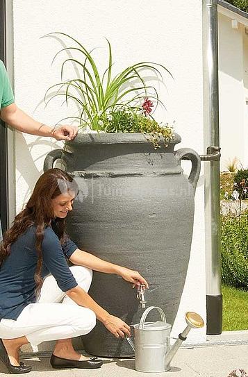 De Amphore regenton met bloembak is een ton gemaakt van kunststof die maar liefst 360 liter regenwater kan opvangen. Het regenwater komt uiteindelijk in de ton terecht via de regenpijp, maar ook via de plantenbak. Om ervoor te zorgen dat het regenwater niet wordt verontreinigd met potgrond uit de plantenbak is de plantenbak voorzien van een viltlaag. Onderaan de regenton zit een aftappunt die het makkelijker voor u maakt om de regenton in de winter leeg te laten lopen om zo te voorkomen dat de ton kapot vriest. De Amphora regenton wordt geleverd met een chromen kraan en is tevens verkrijgbaar in de kleuren terracotta en zandsteen.