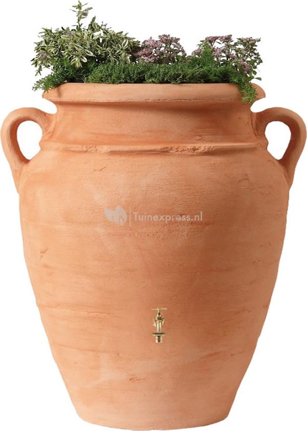 De Amphore regenton met bloembak is een ton gemaakt van kunststof die maar liefst 360 liter regenwater kan opvangen. Het regenwater komt uiteindelijk in de ton terecht via de regenpijp, maar ook via de plantenbak. Om ervoor te zorgen dat het regenwater niet wordt verontreinigd met potgrond uit de plantenbak is de plantenbak voorzien van een viltlaag. Onderaan de regenton zit een aftappunt die het makkelijker voor u maakt om de regenton in de winter leeg te laten lopen om zo te voorkomen dat de ton kapot vriest. De Amphora regenton wordt geleverd met een messing kraan en is tevens verkrijgbaar in de kleuren zandsteen en antraciet.