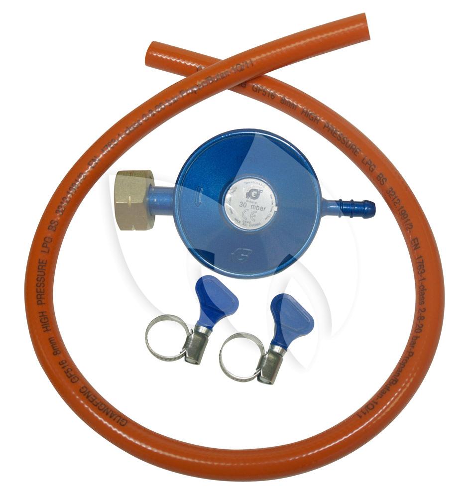 Universele gasdrukregelaar met slangpilaar en slanglengte 0,75 mtr. Slangdiameter: 8x15 mm.