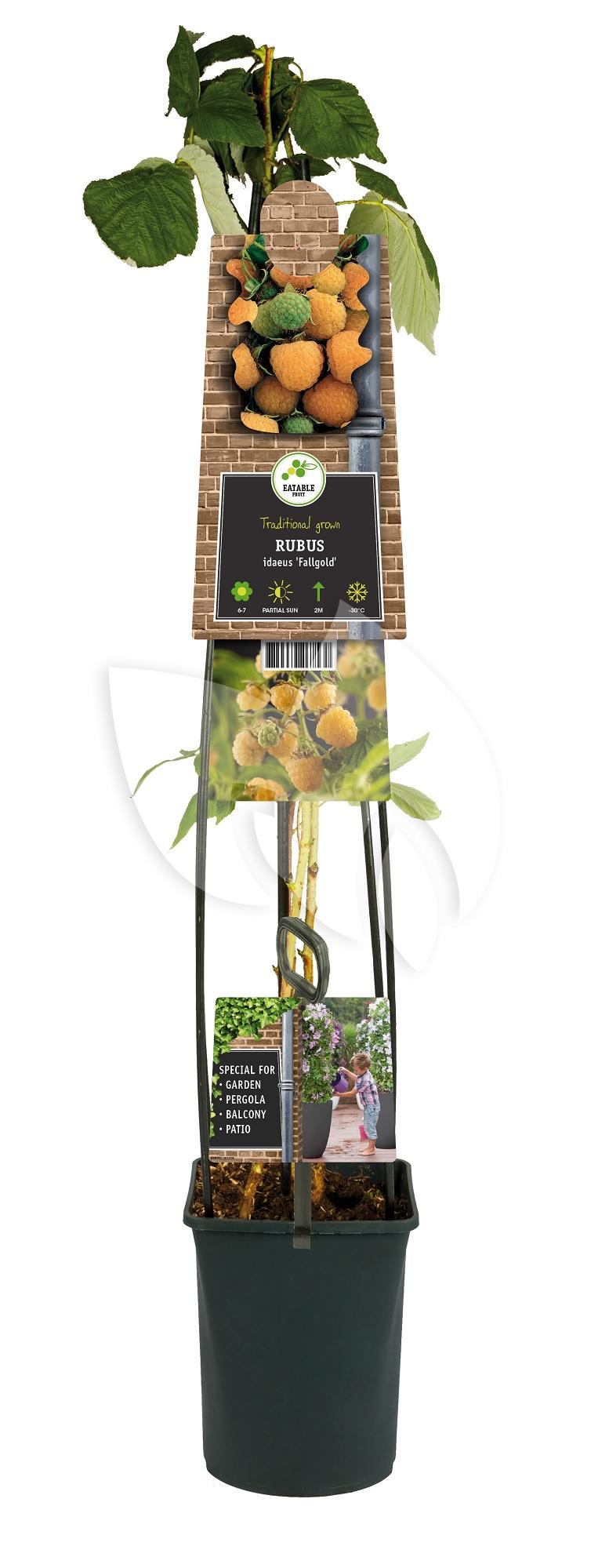 De Gele Framboos Rubus Idaeus Fallgold L 120 cm klimplant is een herfstframboos. De Gele Framboos Rubus Idaeus Fallgold L 120 cm klimplant is niet de gebruikelijke roze framboos maar de framboos heeft een gele kleur. De framboos heeft een heerlijk zoete smaak. De plant is winterhard en verliest zijn blad in de winter.