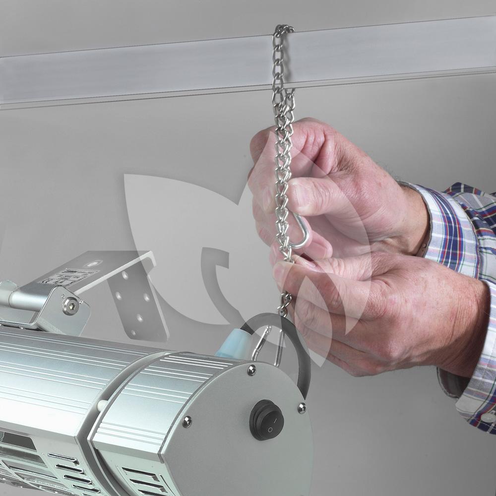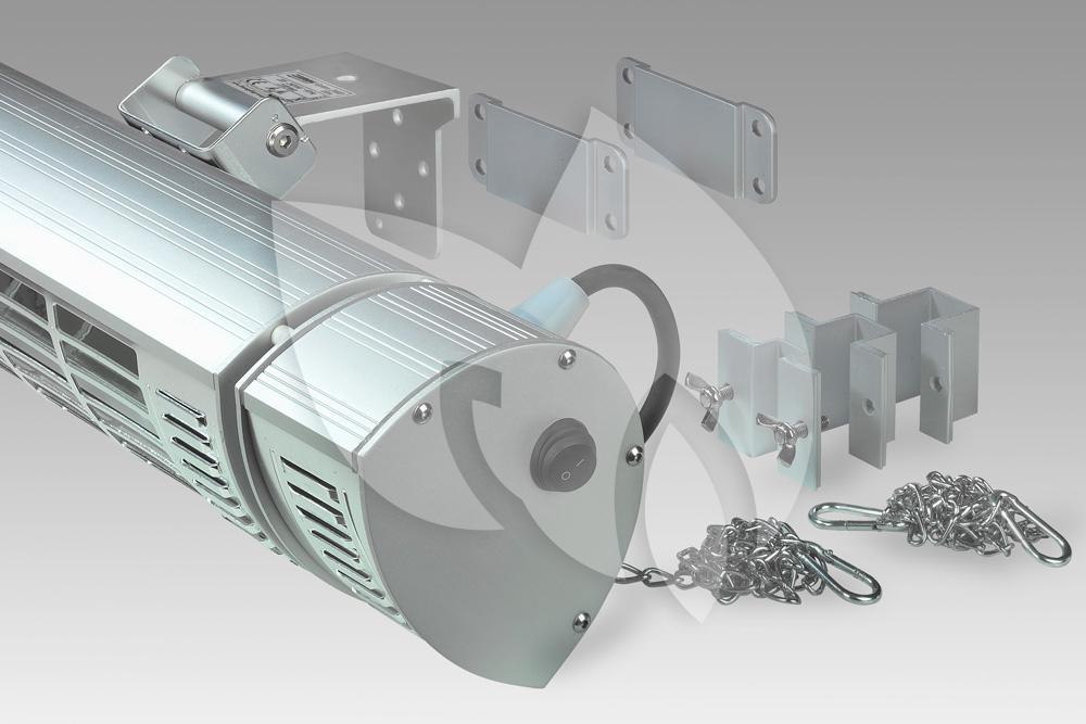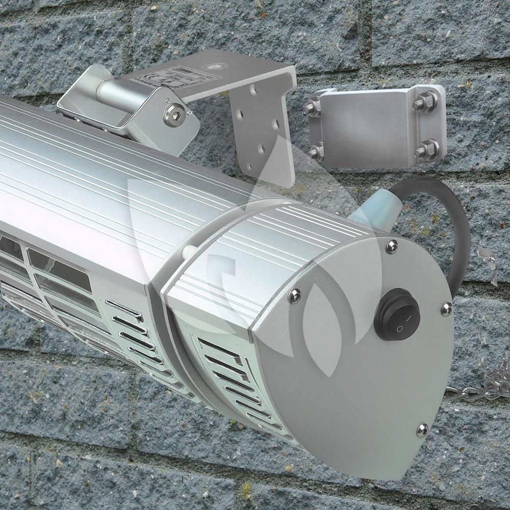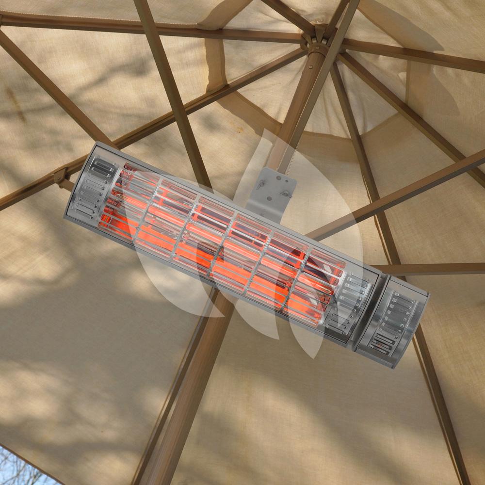 De Golden 2000 Ultra RCD terrasverwarmer heeft diverse toepassingsmogelijkheden. U kunt de terrasverwarmer op de volgende drie manieren installeren: bevestigen aan een muur of plafond , ophangen aan een tentframe of parasol en ophangen aan het plafond. Optioneel kunt u ook de terrasverwarmer plaatsen op een standaard. Dankzij de dubbele isolatie wordt de bovenzijde niet extreem heet, dit maakt het veilig om de terrasverwarmer aan de spaken van een parasol op te hangen. De terrasverwarmer wordt geleverd inclusief 2 muursteunen, drie verschillende maten beugels, set kettingen met 2x2 karabijn-haken, afstandsbediening en bevestigingsmateriaal.