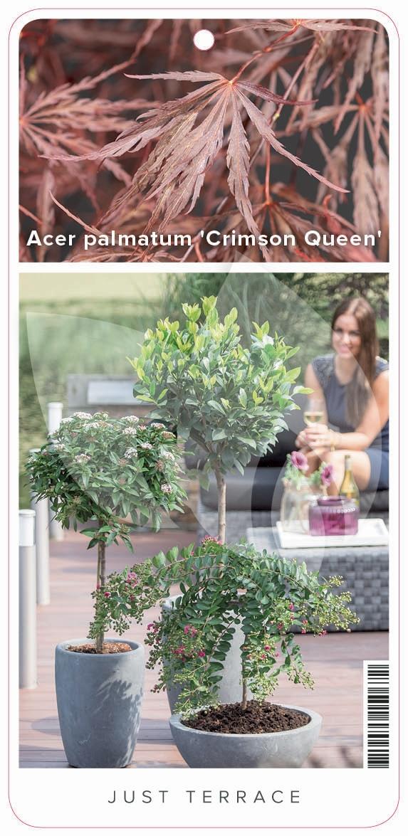 De Japanse esdoorn “Crimson Queen” op stam groeit de hoogte in voor hij breed uitwaaiert in paraplu vorm. Het is een langzame groeier die een prachtige herfstkleur in uw tuin brengt. Het prachtige paarsrode blad en stelen contrasteert enorm met het vele groen in uw tuin waardoor het een in het oog springende plant is. De rode stelen zorgen voor een karakteristiek silhouet zodra het blad gevallen is.