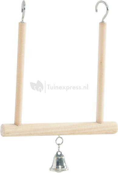 Een houten schommel waarop uw vogel lekker kan gaan zitten. Makkelijk op te hangen door de 2 metalen haken aan de bovenzijde. Inclusief bel.