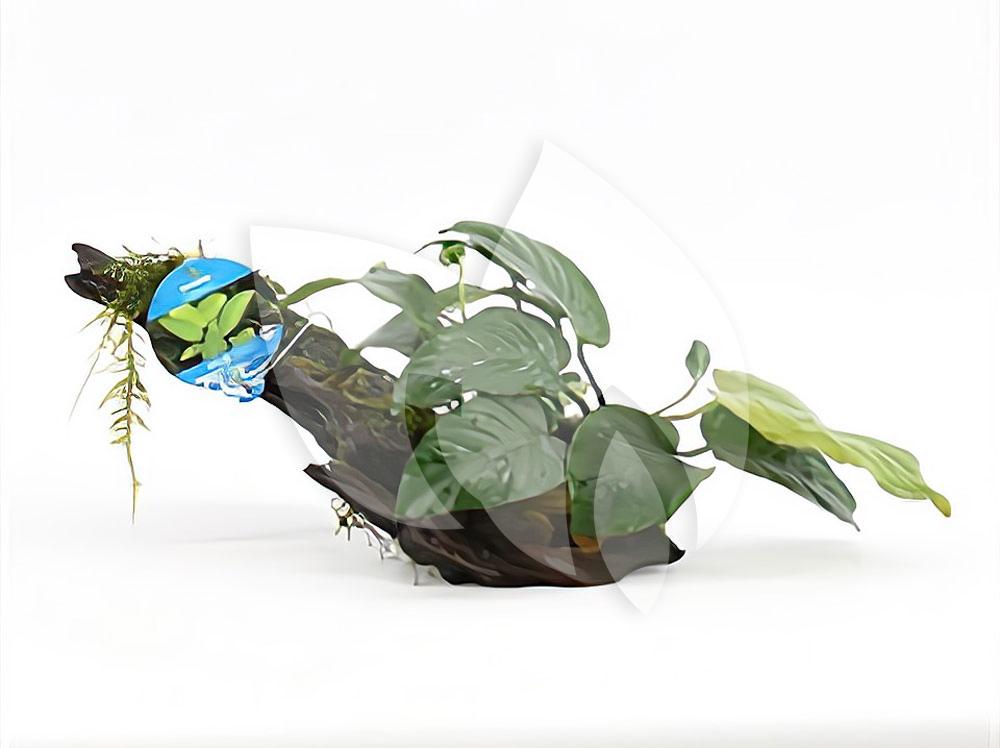 Deze Anubias barteri is op drijfhout gebonden en is een makkelijk te onderhouden waterplant. Deze plant kan goed tegen een hogere watertemperatuur en tevens heeft de Anubias barteri niet veel licht nodig. De bladeren zijn leerachtig en zijn diepgroen van kleur.
