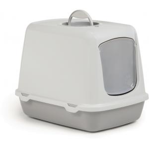 Een solide kattentoilet genaamd Oscar. Dit toilet is voorzien van een deurtje, filter en handvat. Kleur onderbak: donkergrijs, kleur bovenkap: wit.