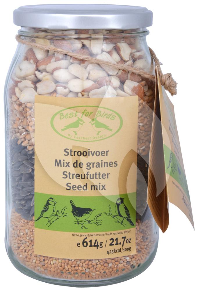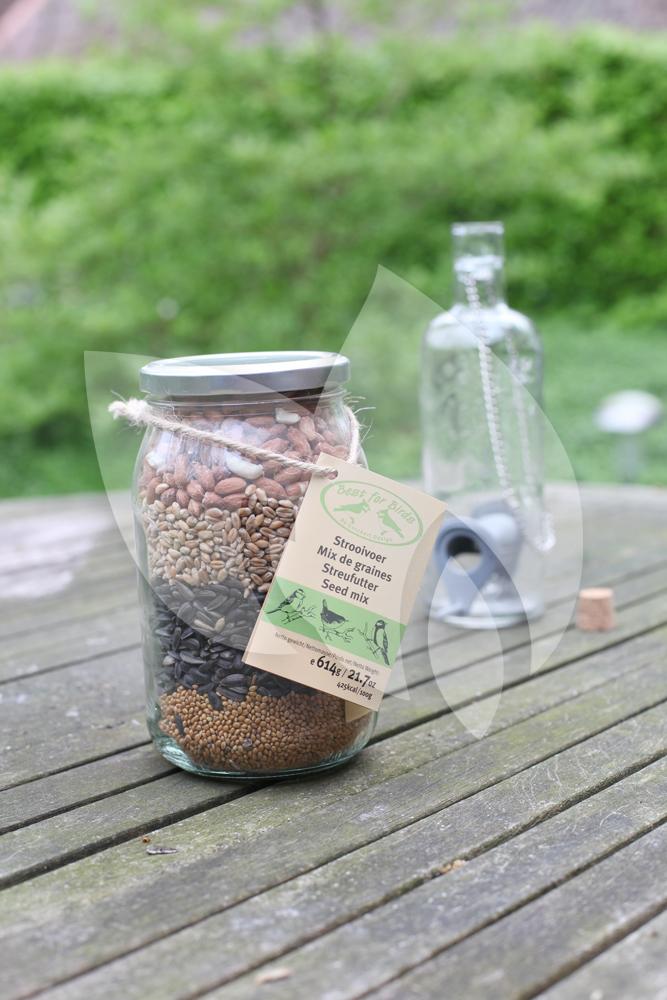 Deze glazen pot is gevuld met vier verschillende soorten strooivoer. Voor iedere vogel wat wils! Strooivoer kunt u op de voedertafel strooien. Maar heeft u geen kat, dan kunt u het vogelvoer ook gewoon op uw terras of gras strooien. Strooi het voer bijvoorbeeld eens in een leuke vorm en geniet van de vogels die gretig van het voer zullen genieten. De decoratieve glazen pot is tevens zeer leuk om cadeau te geven.