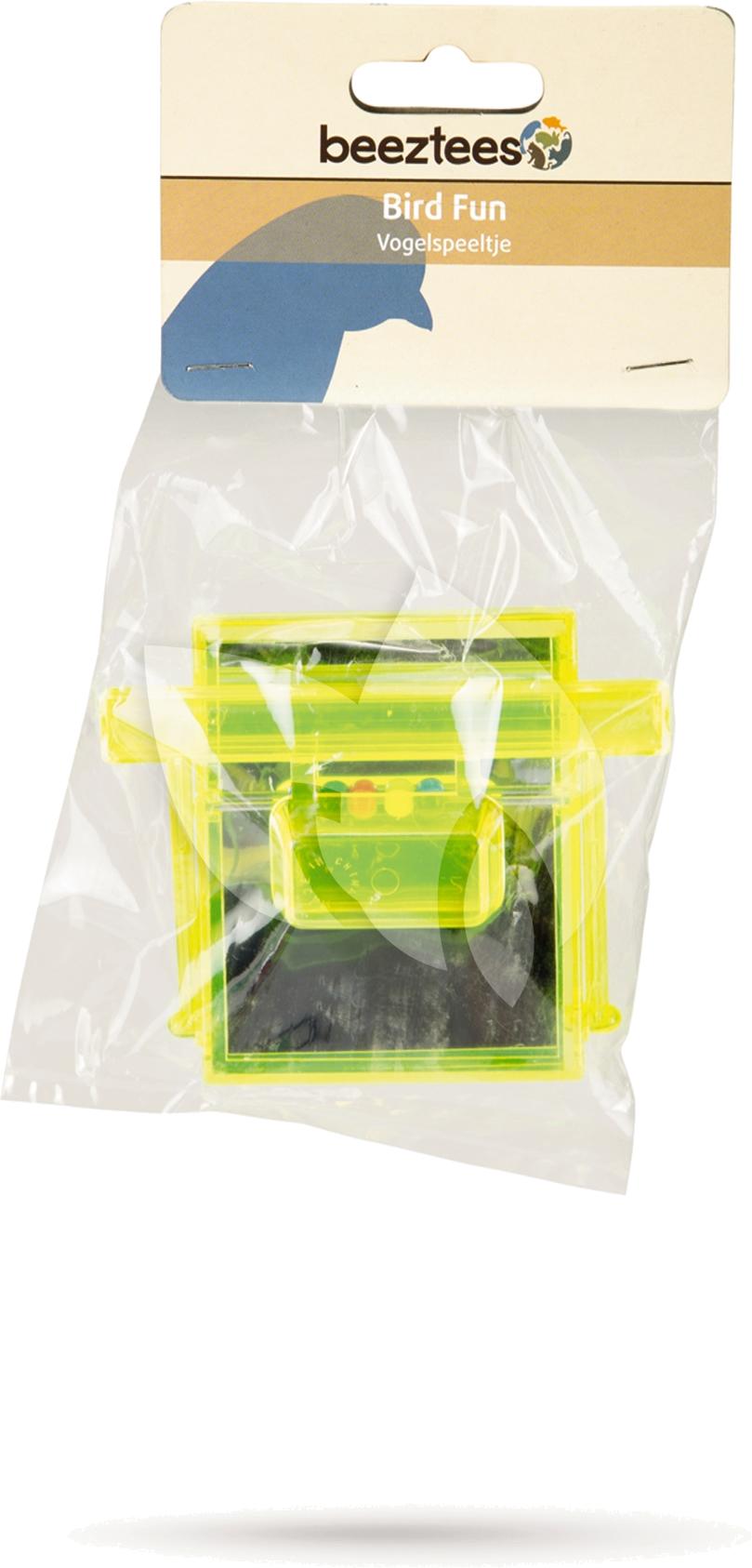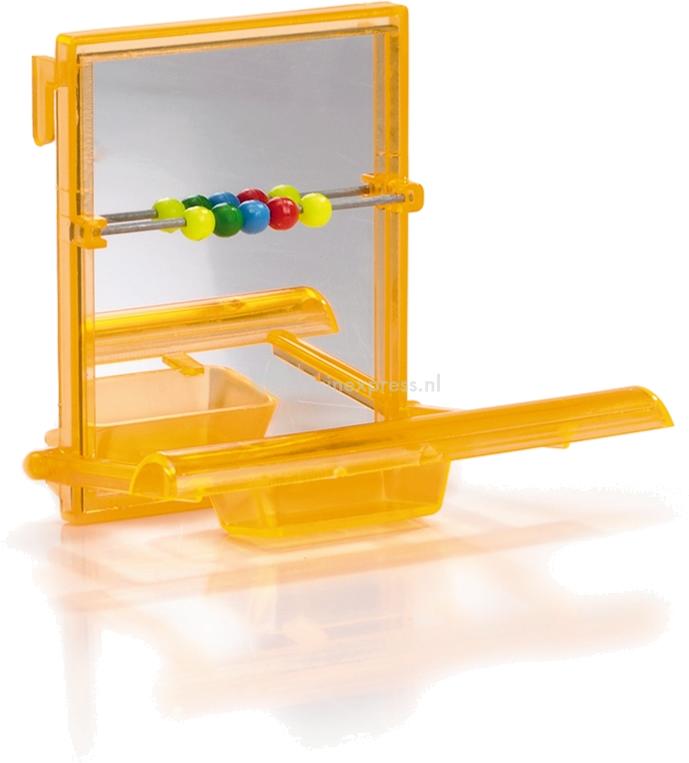 Een plastic kaptafeltje voor parkieten, voorzien van een spiegel. Aan de achterzijde zitten 2 haken, zodat u deze kaptafel makkelijk aan de tralies kunt ophangen. Inclusief plastic zitstokje aan de voorzijde. Kleur: geel.