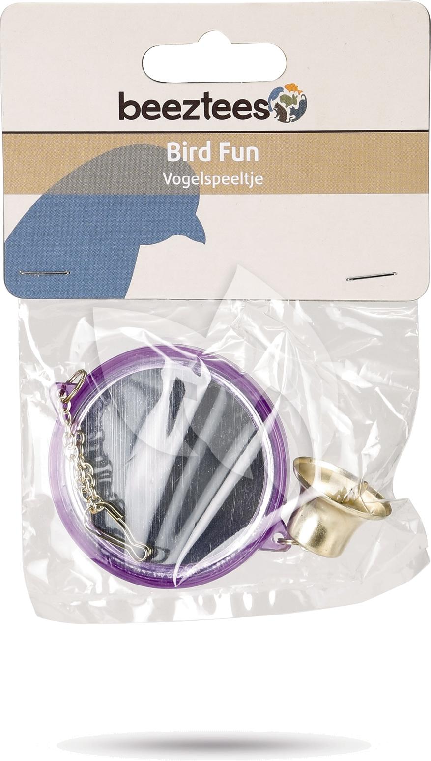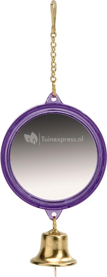 Spiegel met bel voor vogels rond Een plastic ronde parkieten spiegel voor in de vogelkooi. Inclusief bel en ophangketting. Specificaties: