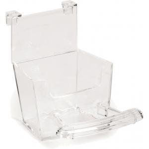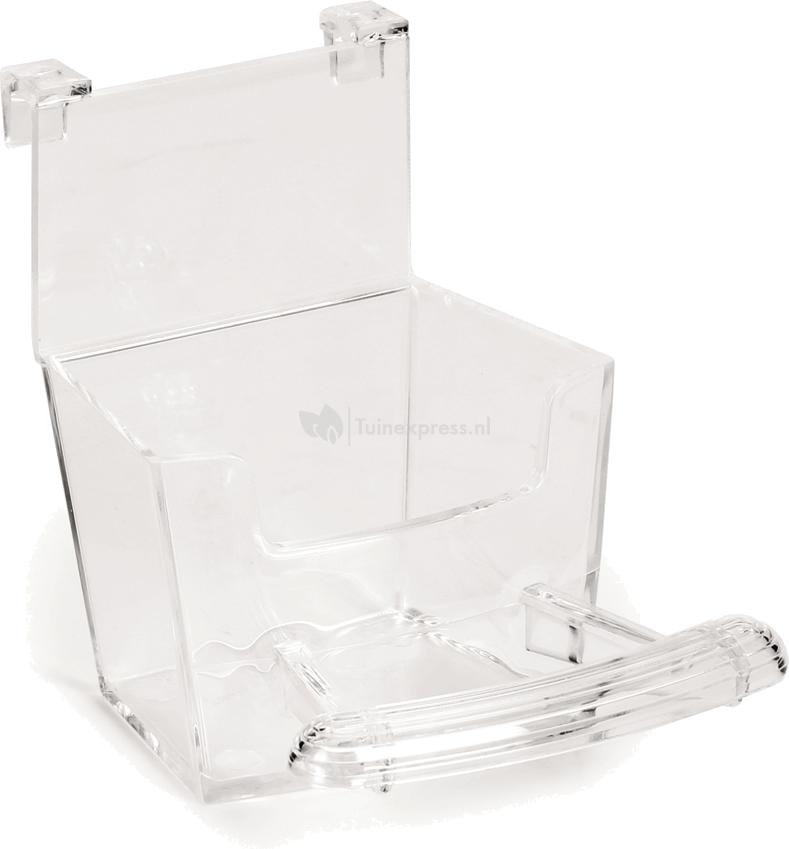 Een plastic drink of eetbakje om in de vogelkooi te hangen. Model open. Kleur: transparant.