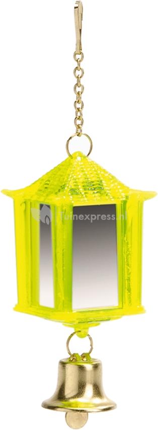 Een vrolijke parkietenlantaarn met aan 4 zijdes een spiegel. Inclusief bel en ophangketting.