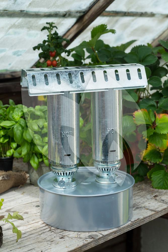 Deze kasverwarmer is voorzien van twee branders en geeft hierdoor extra warmte af. De warmte die deze kasvermer afgeeft staat gelijk aan 1200 watt. De verwarmer heeft een capaciteit van 4,5 liter, dit is goed voor een brandduur van ongeveer 4 dagen. De kasverwarmer voorkomt vorstschade aan uw kas tot een oppervlakte van 5m2.
