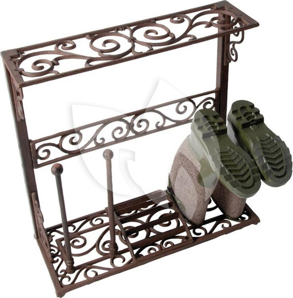 Het laarzenrek is gemaakt van gietijzer en heeft een sierlijke frame met Victoriaanse krullen. Door het sierlijke ontwerp van het laarzenrek is hij niet alleen zeer functioneel, maar is het ook een decoratief element naast uw deur of in de hal. Het laarzenrek heeft een hoogte van 60 centimeter en wordt geleverd als bouwpakket.