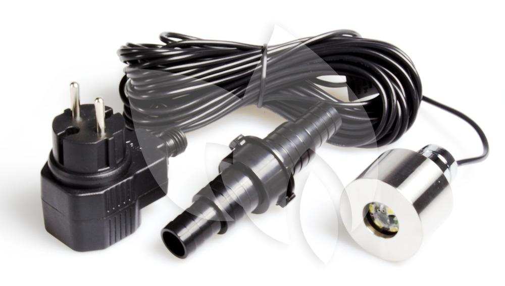 De Lunaled 9s is een LED-verlichting die zorgt voor bijzondere sfeer in uw tuin. De innovatieve, witte LED dioden zijn voorzien van een hoogwaardige roestvrijstalen kap die hen beschermd tegen beschadigingen en maakt tevens een snelle regeling van het waterdoorstroomvolume mogelijk. Dankzij de innovatieve slangverbinding met uitgang voor de netkabel is de installatie van deze verlichting heel eenvoudig. De slang wordt onder de bronsteen doorgesneden en de slangkoppelaar wordt ertussen geplaatst. Zo kan de netkabel heel eenvoudig door de koppelaar naar buiten worden geleid en hoeft hij niet meer met veel moeite door de hele lengte van de slang getrokken te worden. Eenvoudige installatie met een overweldigend effect!