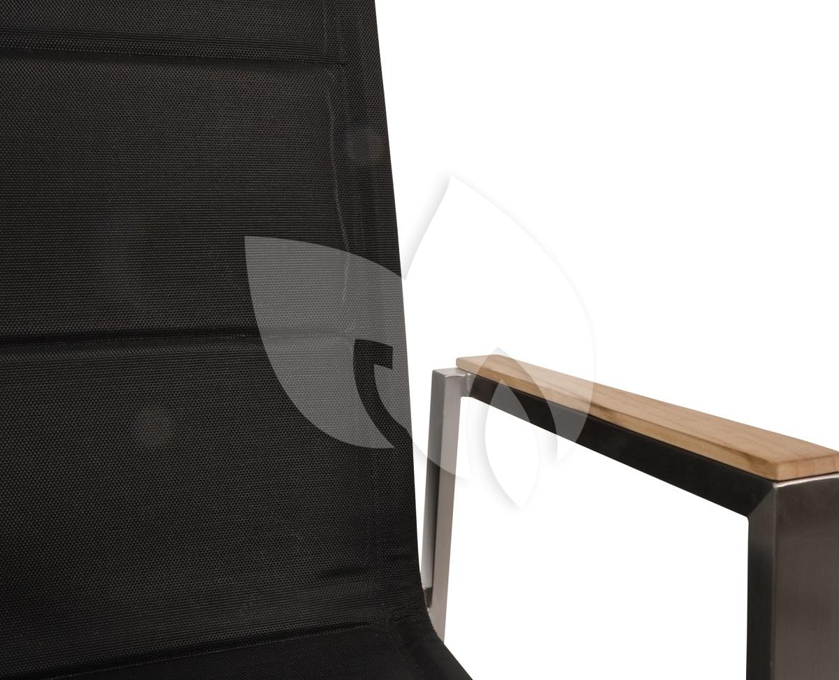 De zwarte tuinstoel Marmaris is voorzien van een hoge rugleuning. De stoel heeft een luxe uitstraling door het gebruik van materialen zoals RVS in combinatie met het hout van de armleuning. De stapelstoel is licht van gewicht en daardoor makkelijk te verplaatsen. De stoel is eenvoudig te stapelen en bij het opbergen bespaart dat ruimte.