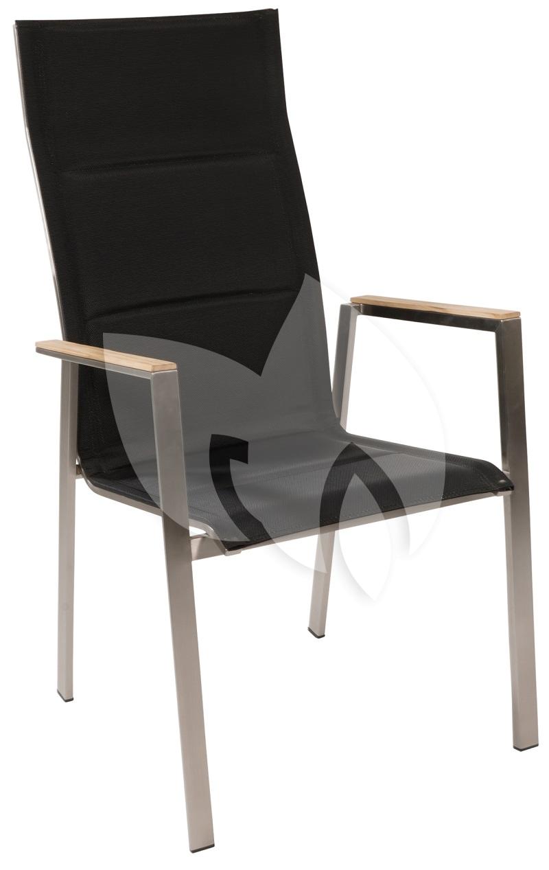 Stapelbare tuinstoel Marmaris heeft een RVS frame een hoge rugleuning en met teakhout beklede armleuningen. De zitting en de rugleuning van deze stapelstoel zijn bekleed met weer- en UV bestendige textileen stof. Door het gebruik van een vocht en luchtdoorlatende schuimrubber vulling voor de kussens is de stoel comfortabel. De stoel kan door deze materiaaleigenschappen buiten gebruikt worden.