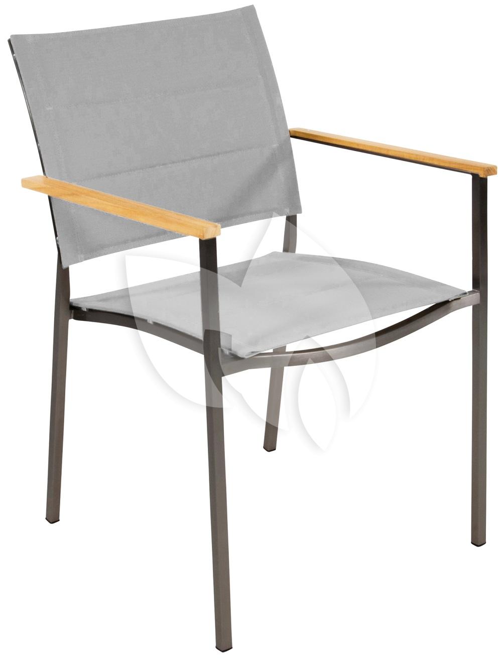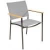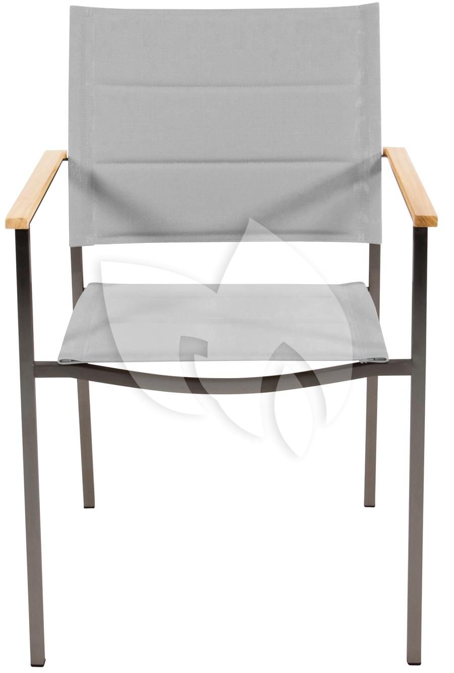 Stapelbare tuinstoel Marmaris heeft een RVS frame en met teakhout beklede armleuningen. De zitting en de rugleuning van deze stapelstoel zijn bekleed met weer- en UV bestendige textileen stof. Door het gebruik van een vocht en luchtdoorlatende schuimrubber vulling voor de kussens is de stoel comfortabel. De stoel kan door deze materiaaleigenschappen buiten gebruikt worden.