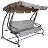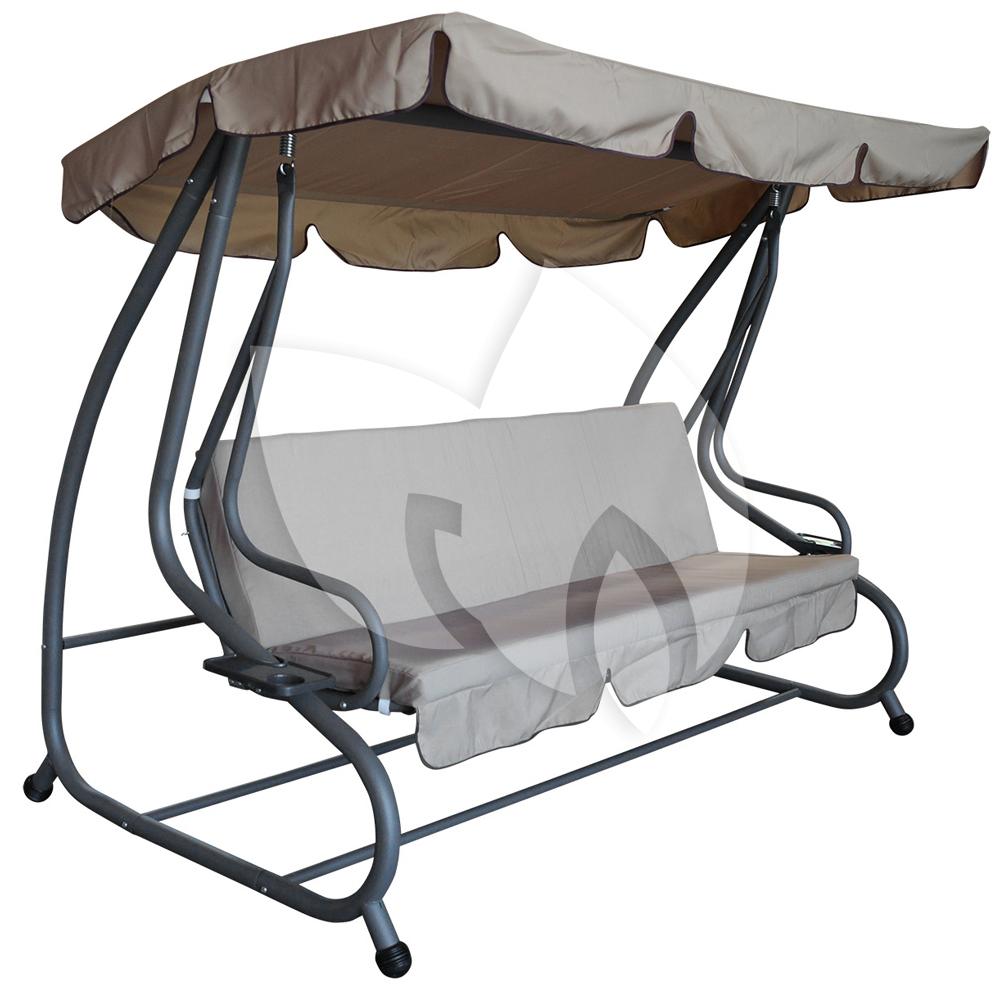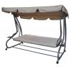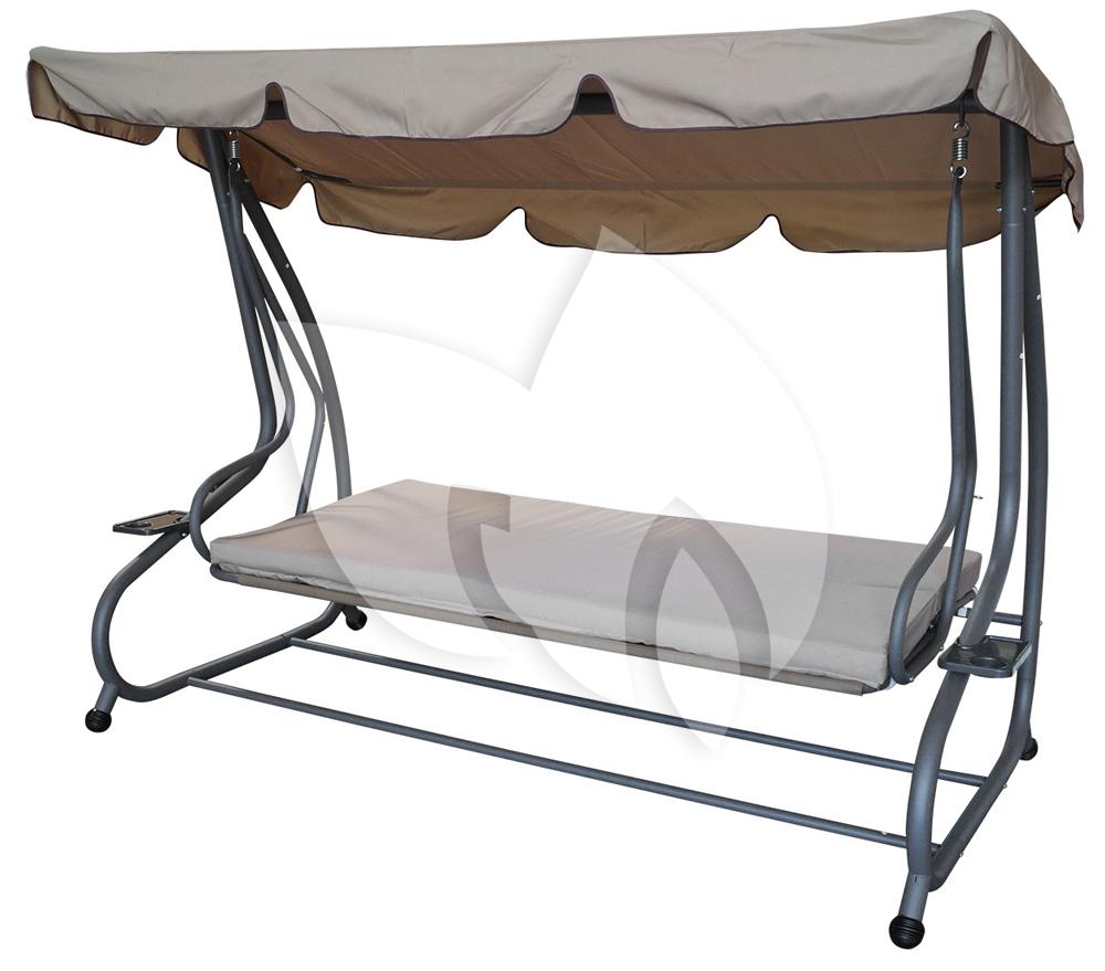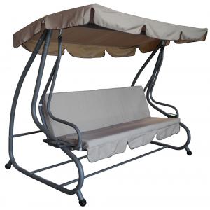 Het robuuste, stevige frame is grijs gepoedercoat. Beide zijkanten zijn uitgerust met een dienblad zodat u een drankje en zonnebril kwijt kan. Weerbestendig polyester wordt gebruikt voor alle stoffen onderdelen van de schommel tuinbank. Het polyester is crèmekleurig en afgewerkt met een chique bruine bies.