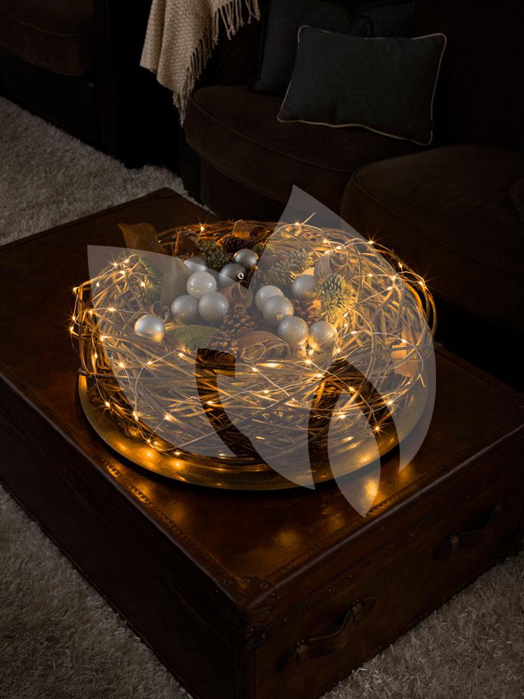 Wel 100 LED lampjes laten dit witte lichtdraad stralen! Het lichtsnoer is bijna 10m lang en heeft daarnaast nog een aansluitsnoer van 5m. Het witte metaaldraad heeft een moderne uitstraling en is uitermate geschikt voor de verlichting van kransen, guirlandes en andere accessoires. Uiteraard kunt u het lichtdraad ook gebruiken om uw kerstboom te verlichten. De verlichting heeft een extra warmwit lichtkleur, dit is vergelijkbaar met amberkleur. Lichtsnoeren met extra warmwit licht zijn zeer populair als sfeerverlichting. Decoreer uw woning tijdens de wintermaanden met deze moderne lichtdraad en creëer de ultieme kerstsfeer!