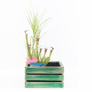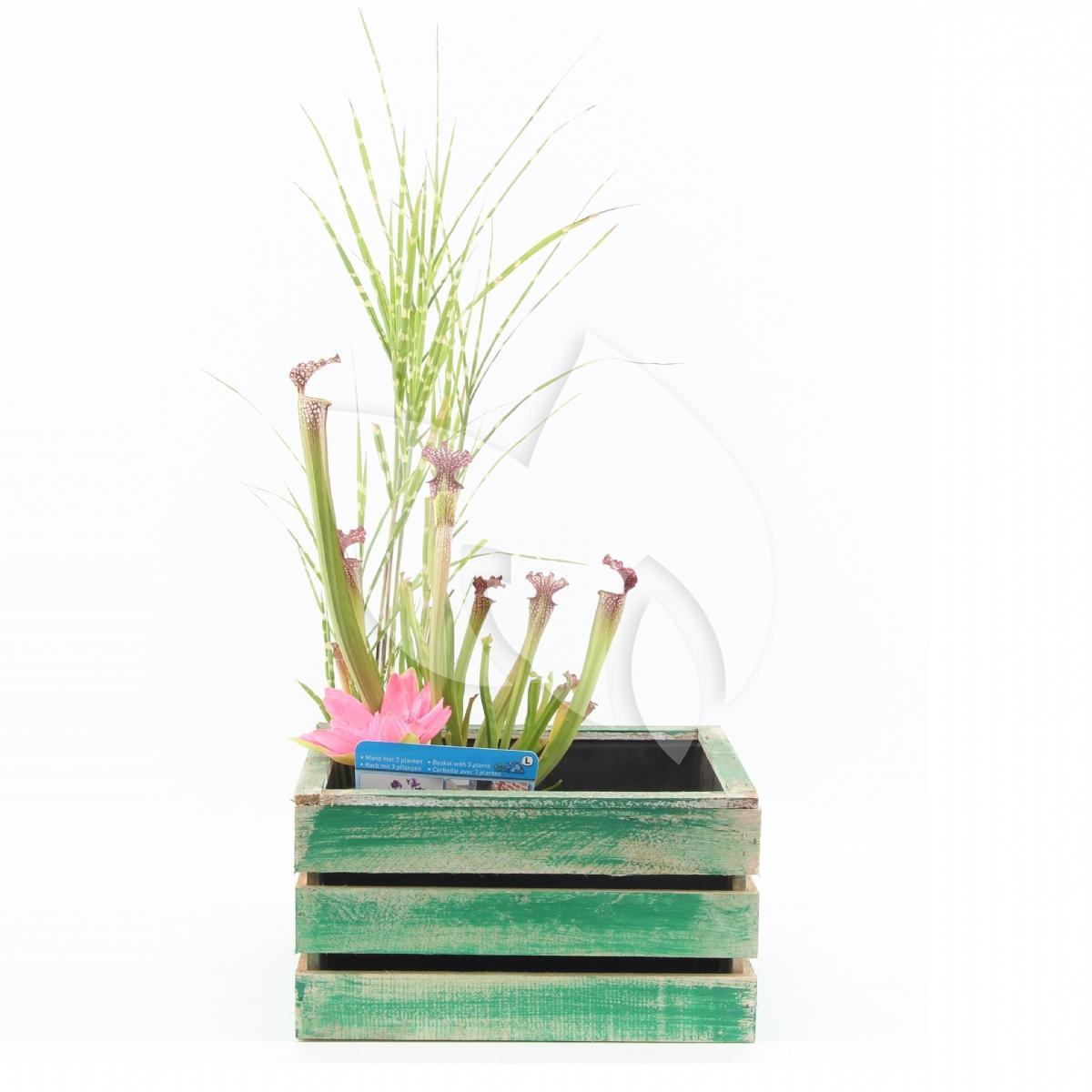 Anders dan anders; dat is een mini vijver in dit geweldige groene houten kistje met 'used look'. Deze vintage uitstraling maakt het kistje helemaal af. Bij het kistje krijgt u een vijvermand geleverd met een combinatie van 3 waterplanten. Nadat u de vijvermand in het kistje hebt geplaatst voegt u leidingwater toe en uw mini vijver is al klaar! Geniet van wuivende waterplanten in deze hippe mini vijver!