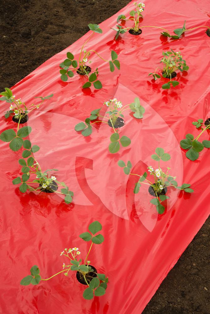 Dit rode kweekfolie werkt positief door op de groei van uw aardbeienplanten. Het folie is voorzien van microscopisch kleine gaatjes wat zorgt voor een goede bewatering van de kroonwortel. De rode kleur zorgt voor een weerkaatsing van licht, dit zorgt voor een positieve beïnvloeding van het suikergehalte en de zachtheid van het fruit. Daarnaast zal ook de oogst toenemen met 12 tot 20%. De folie is bruikbaar bij alle soorten aardbeienplanten.