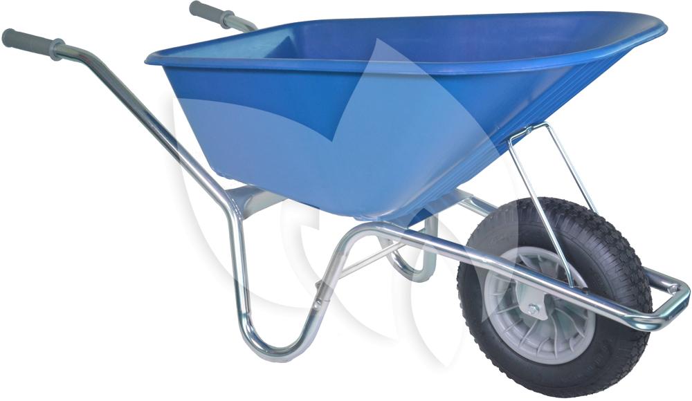 Een kruiwagen met een opvallende blauwe polypropyleen bak. Het frame is erg stevig en gemaakt van metaal. Het frame is afgewerkt met een laag zink, dat het frame intact houdt, ook bij slecht weer. De inhoud van de bak is 100 liter, hierdoor kunt u veel spullen tegelijk vervoeren.