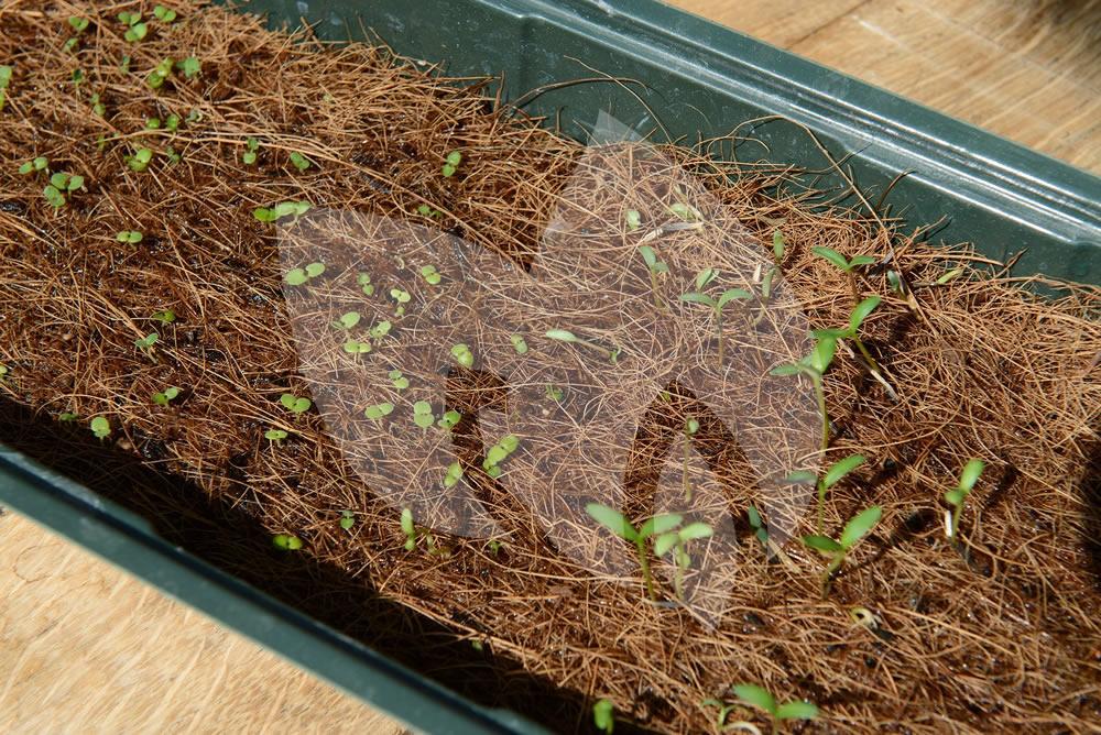 Voor het verpotten van de ontkiemde zaailingen wordt aangeraden om kleine sneetjes of gaatjes te maken in de kokosmat zodat de stekjes er doorheen kunnen groeien.