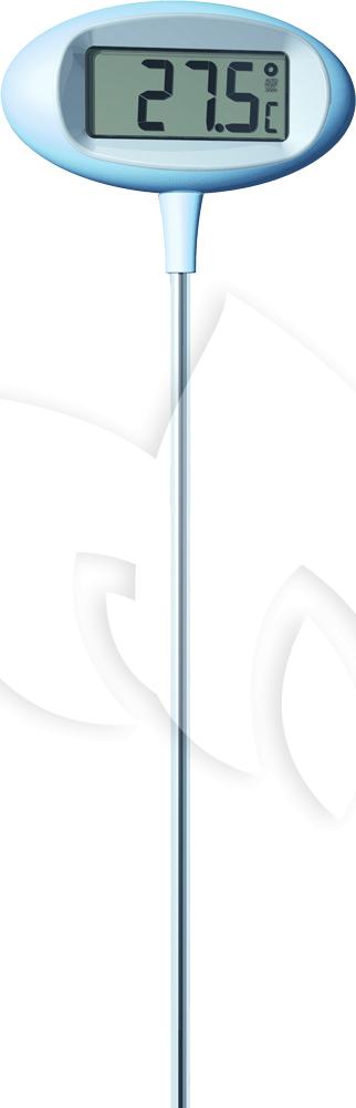 De thermometer heeft een totale lengte van 80 cm. Het scherm is lichtblauw van kleur en is maar liefst 23cm breed. Het display werkt op 2 1,5V AA batterijen, welke zijn inbegrepen.
