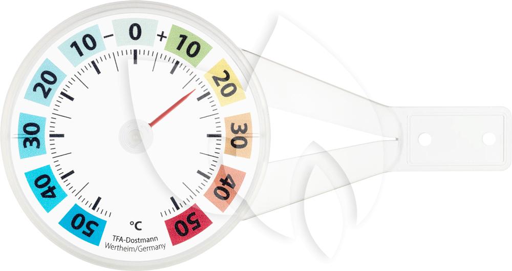 Deze kunststof vensterthermometer vertelt u de temperatuur op twee manieren, u kunt uiteraard de schaalverdeling aflezen maar ook de kleuraanduiding duidt op de buitentemperatuur. Hoe koeler de kleur (oplopend naar donkerblauw) hoe kouder het buiten is, hoe warmer de kleur (oplopend naar rood) hoe hoger de buitentemperatuur is.
