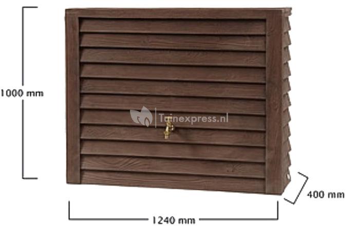 De stijlvolle regenton Woody is gemaakt van kunststof met een realistisch donkerbruin houtstructuur. De regenton heeft een inhoud van maar liefst 350 liter. Het opgevangen regenwater kunt u doormiddel van de bijgeleverde messing kraan eenvoudig uit de regenton tappen.