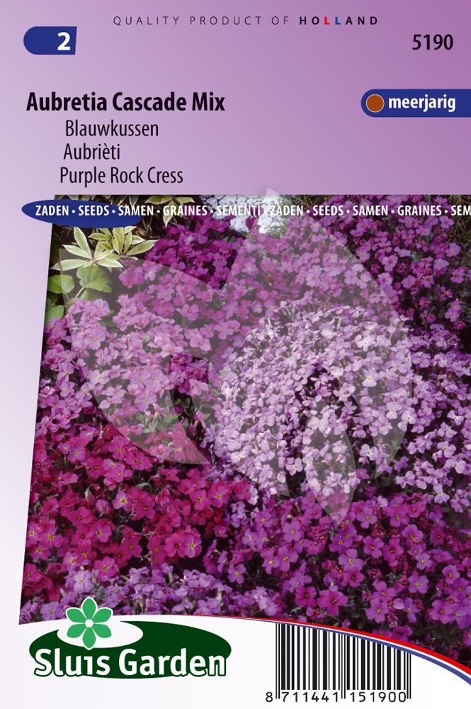 De Blauwkussen Cascade Mix is een lage, kussenvormende plant. De Aubretia houdt van een kalkrijke grond en is vanaf eind maart tot ver in de maand juni overdekt met bloemen gevarieerd in blauwe, paarse, roze en rode tinten. Zaaien in de volle grond of op zaaibed. Uitplanten in de nazomer op plaats van bestemming.