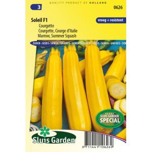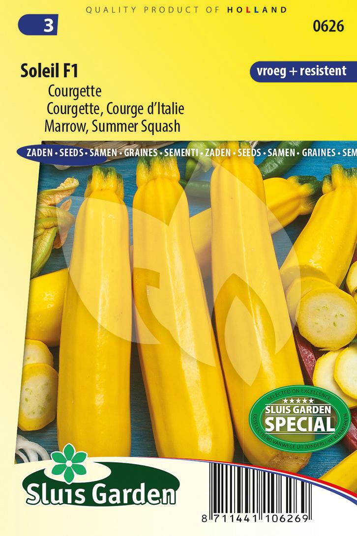 De Soleil F1 is een gladde, goudgele vrucht met crèmewit vruchtvlees. De gele courgette rankt niet en kunt u daardoor zaaien onder glas, in de volle grond of in een grote pot. De courgette is wel een warmteminnend gewas waardoor de voorkeur uit gaat naar voorzaaien onder glas op potjes van ca. 14 cm. Eind mei kunt u de zaden ook buiten zaaien op een zonnige, humusrijke, beschutte plaats. Deze courgetteplant is er eentje van het middelvroege soort waardoor de bloemen al in een jong stadium eetbaar zijn. Omdat u de vruchten al vroeg kunt eten, wordt jong oogsten aangeraden. Dankzij het voortdurend oogsten zal de plant langer doordragen en wordt de aanmaak van nieuwe bloemen en vruchten bevorderd. U heeft voortaan altijd verse courgettes in huis om kleurrijke gerechten te kunnen bereiden!