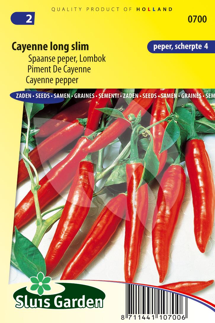 Peper heeft veel warmte nodig waardoor u het beste kunt gaan zaaien onder glas op een zaaibed of direct in 10 cm potjes. Na opkomst moeten de zaailingen verspeend worden en later in een koude kas of buiten op een warme beschutte plaats uitgeplant worden. De Cayenne long slim heeft een opbrengst van circa 25 vruchten per plant.