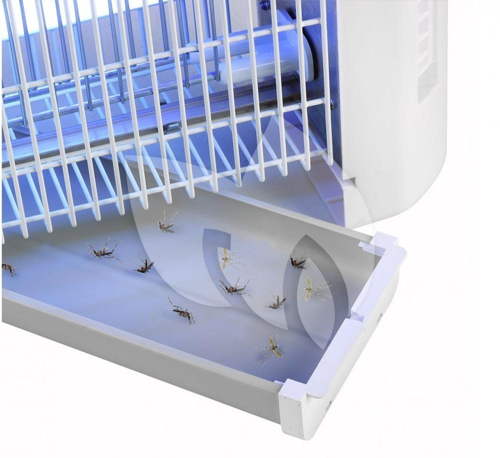 Kantoor, winkel en huis is zoem-vrij wanneer u deze insectenlamp in uw ruimte plaatst. De insectenlamp heeft een bereik van 150m². De UV-verlichting zorgt dat de vliegende insecten aanvliegen, eenmaal aangekomen in de lamp worden zij geëlektrocuteerd waarna ze in het opvangbakje vallen. Wanneer dit wenselijk is kunt u in het reservoir een lokmiddel toevoegen.
