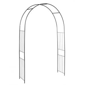 Boogvormige zwart ijzeren rozenboog met spijlen als geleiders