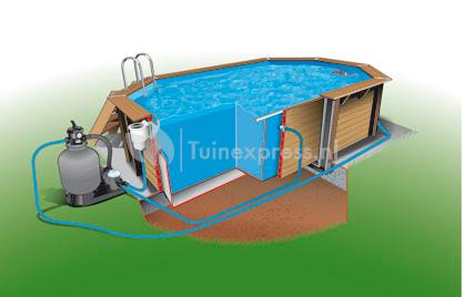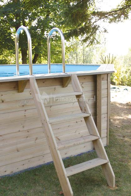 Inclusief: Vurenrand (aliminium afwerking), Skimmer, Houten trap buitenzijde (4 treden, verwijderbaar ter beveiliging van kinderen), Binnentrap (roestvrijstaal met 3 treden), Filterset, Isolatiezeil met rand
