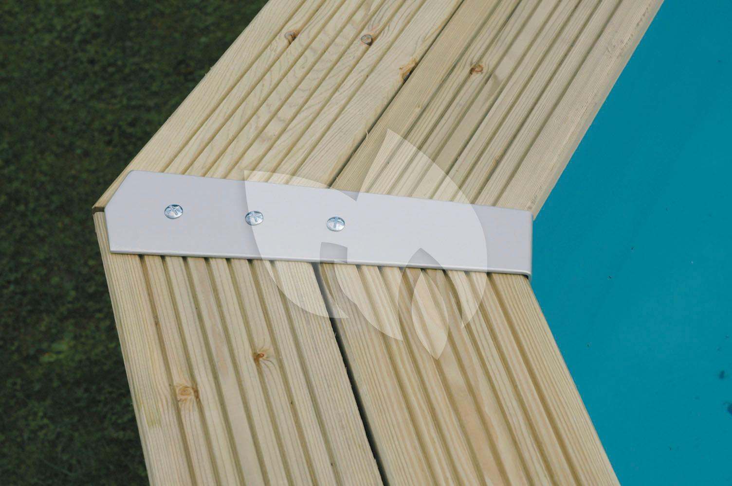 1. Structuur met eenvoudige verbinding De planken hebben groeven en inkepingen aan het uiteinde. Zo passen ze eenvoudig in elkaar, waarbij de vorm van het zwembad wordt bepaald door de hoek die de inkepingen maken. Deze traditionele methode voor houtconstructies wordt gebruikt voor 'ronde' achthoekige zwembaden. 2. Structuur met versterkte verbindingen Het principe is hetzelfde als bij de eenvoudige verbindingen maar de structuur wordt versterkt met een metalen profiel (onderstel) dat moet zorgen voor meer stijfheid in de langere schotten. Dit wordt toegepast bij achthoekige zwembaden met een langere vorm. Het is belangrijk om rekening te houden met de aanwezigheid van het metalen onderstel (1 tot 3 stuks afhankelijk van het model) bij het uitvoeren van de betonnen fundering. 3. Structuur met palen en liggers Deze innovatieve methode die is ontwikkeld door onze R&D afdeling, bestaat uit liggende planken die worden ondersteund door verticale palen die de stijfheid van het geheel garanderen. De wanden worden gevormd door een aaneenschakeling van deze combinatie van palen/planken. De structuur wordt aan de betonnen fundering bevestigd met gesplitste paalschoenen. Dankzij deze innovatie kunnen we nu rechthoekige zwembaden produceren |
