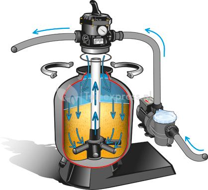 Het water wordt via de pop uit het zwembad opgezogen (skimmer/spoelaansluiting) en vervolgens via de 6-standenklep naar het vat geleid waarin zicht het filtermedium bevindt: zand. Het water wordt onder druk door het zand gepompt. Al het vuil wordt uit het water gehaald waarna het de filters passeert en door de verzamelbuis omhoog wordt gepompt naar de klep. Vervolgens gaat het water terug naar het zwembad.