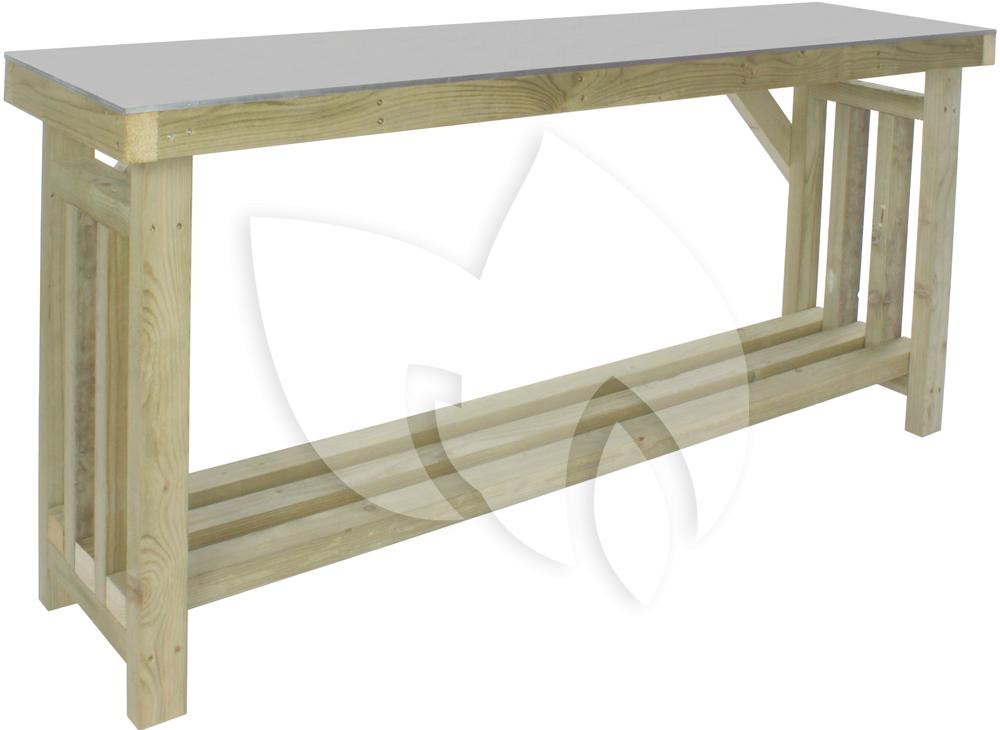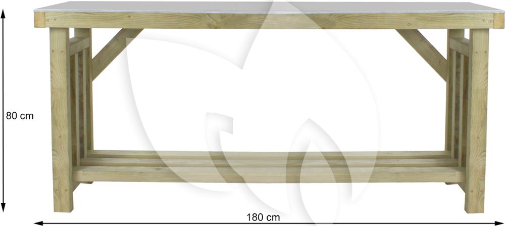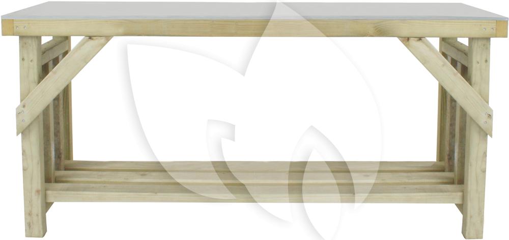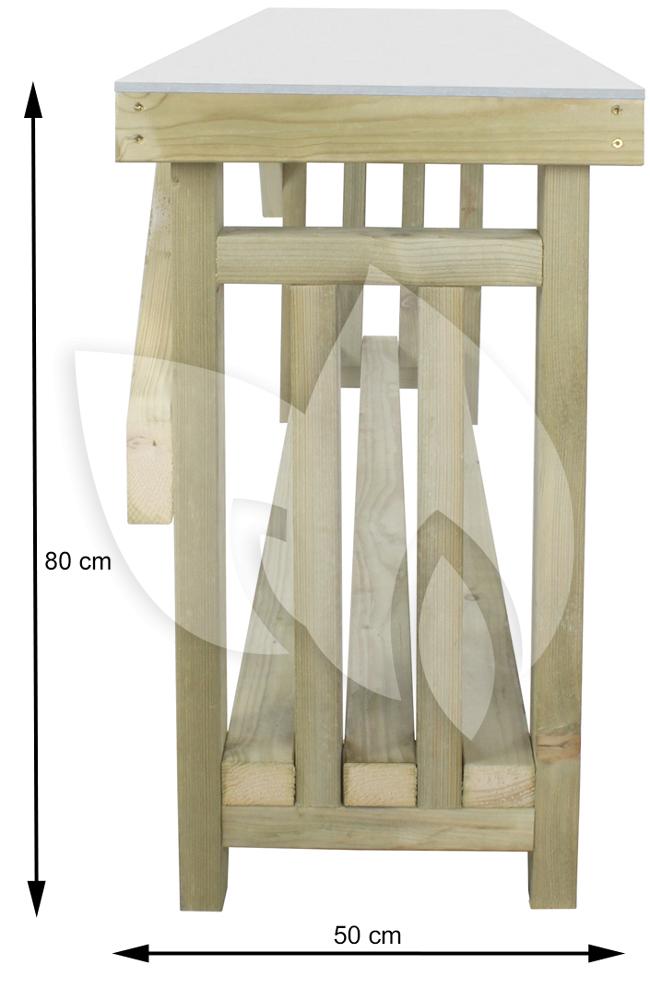 Het robuuste frame van deze grote oppottafel is gemaakt van geïmpregneerd vurenhout en is voorzien van een mooi zinken werkblad. De tafel is gedeeltelijk voor gemonteerd, uiteraard wordt de oppottafel geleverd inclusief montagemateriaal. Het tweede plateau kunt u gebruiken voor de opslag van haardhout of andere tuinbenodigdheden zoals gieters en ongebruikte bloempotten.
