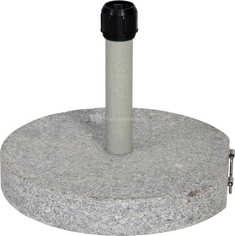 Zet uw parasol stevig en stabiel neer op uw terras met deze parasolvoet graniet rond grijs 30 kg. De parasolvoet is geschikt voor parasols met een stokdiameter tussen de 28 en 48 millimeter en zorgt ervoor dat de parasol niet zomaar omwaait. Het gewicht dat u nodig heeft in de parasolvoet is afhankelijk van de grootte van de parasol. Neem de diameter van de uitgeklapte parasol in centimeters en deel dit door 10, dit is het aantal kilo dat uw parasolvoet minimaal moet zijn. Een parasol met een diameter van 300 centimeter heeft dus een parasolvoet van minimaal 30 kg nodig. Let op: Een zwaardere parasolvoet is altijd beter dan een te lichte parasolvoet! De parasolvoet graniet rond grijs is ook verkrijgbaar in de gewichtsmaat 40 kg.