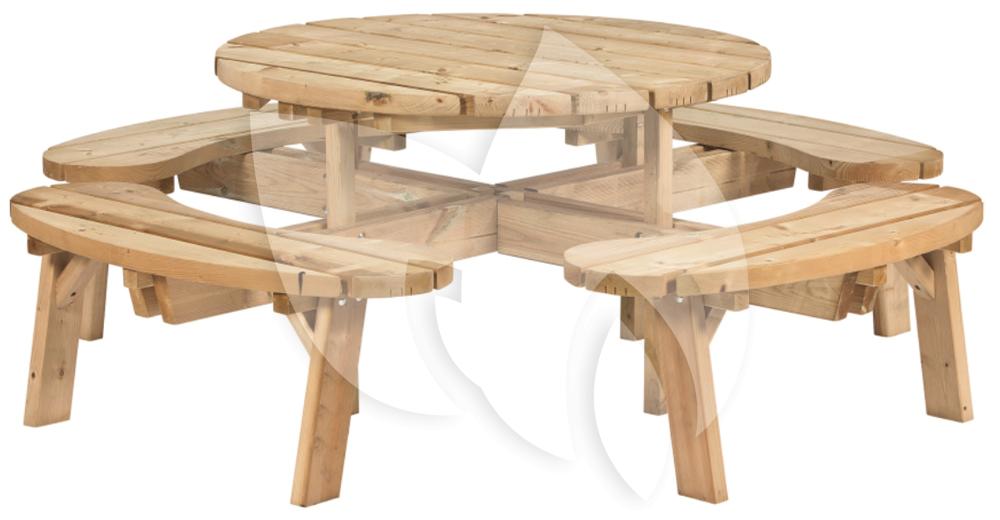 De mooie ronde picknicktafel van geïmpregneerd vurenhout is een aanwinst voor elke tuin of terras. Deze picknicktafel is groot genoeg om maar liefst acht personen te laten aanschuiven. De ideale buitentafel dus om met meerdere mensen te kunnen genieten van een heerlijke lunch of diner.